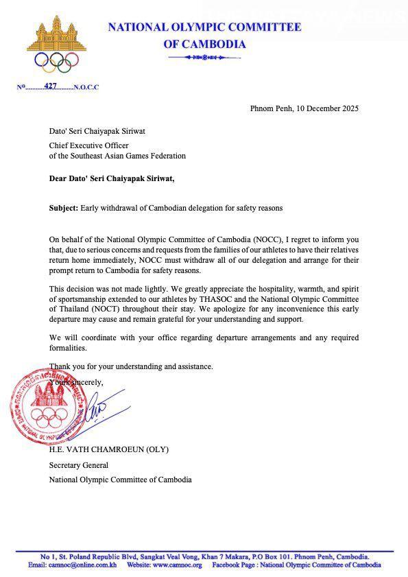 «Με λύπη σας ενημερώνω ότι, λόγω σοβαρών ανησυχιών και αιτημάτων από τις οικογένειες των αθλητών μας για άμεση επιστροφή των συγγενών τους στην πατρίδα τους, η NOCC πρέπει να αποσύρει όλη την αντιπροσωπεία μας και να μεριμνήσει για την άμεση επιστροφή τους στην Καμπότζη για λόγους ασφαλείας», έγραψε στην επιστολή της ο Γενικός Γραμματέας της NOCC, Βαθ Τσαμρόουν. Πρόσθεσε ότι η κίνηση αυτή δεν ελήφθη ελαφρά τη καρδία, επαινώντας τη «φιλοξενία, τη ζεστασιά και το πνεύμα αθλητικού πνεύματος» που επέδειξαν οι Ταϊλανδοί διοργανωτές, αλλά τονίζοντας την επιτακτική ανάγκη να δοθεί προτεραιότητα στην ασφάλεια.